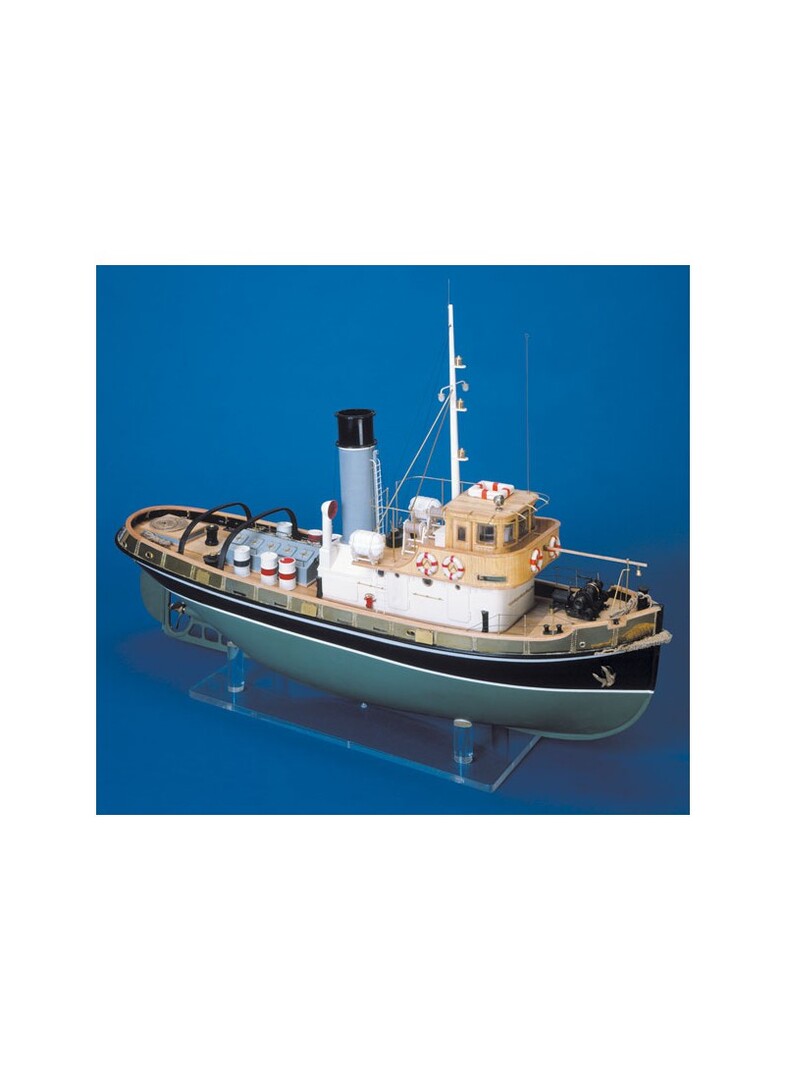 Riproduzione fedelissima di un rimorchiatore portuale a vapore costruito in vasta serie negli anni antecedenti il secondo conflitto mondiale. Se ne possono riconoscere, se pur trasformati nelle loro essenziali sovrastrutture, nei maggiori porti commerciali italiani. Il kit contiene ordinate e ponti tagliati a laser, listellatura, accessori in metallo fuso a cera persa, murate e finestrature in lastre di ottone inciso, piani costruttivi in varie tavole con istruzioni per il montaggio. Il modello è predisposto per il radiocomando.
