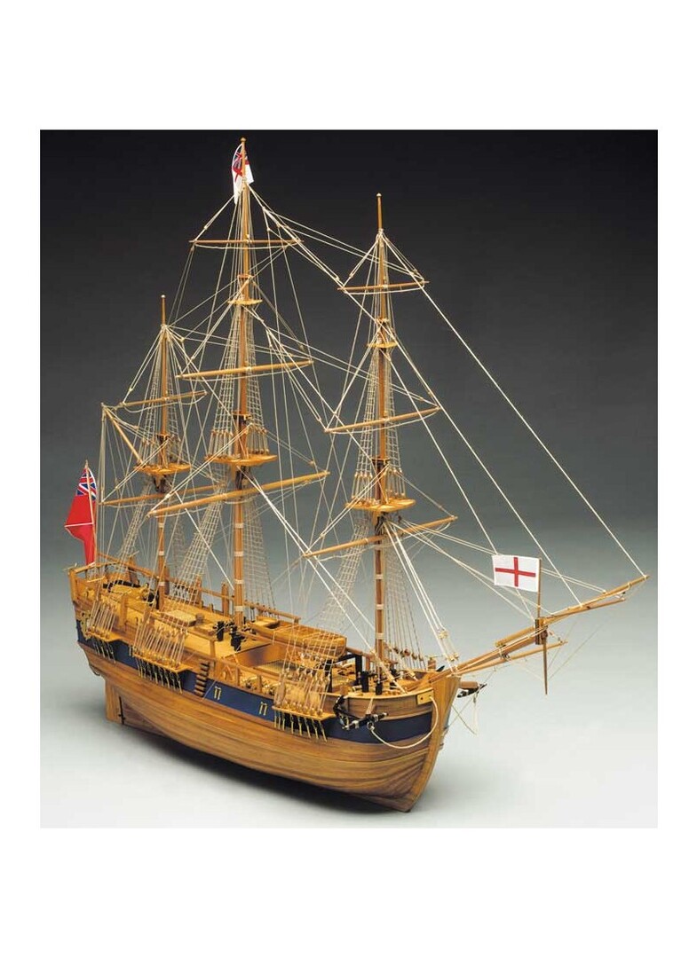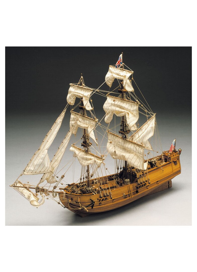 Costruzione a fasciame, ponti in compensato, alberature, listelli e sovrastrutture dei ponti in legno di noce. Tutti i particolari in legno sono pretagliati a laser, 14 bocche da fuoco, bandiere stampate su seta, bigotte e bozzelli in legno, accessori e decorazioni in ottone, manovre funzionanti con canapa. Disegni dettagliati in varie tavole con istruzioni per il montaggio.